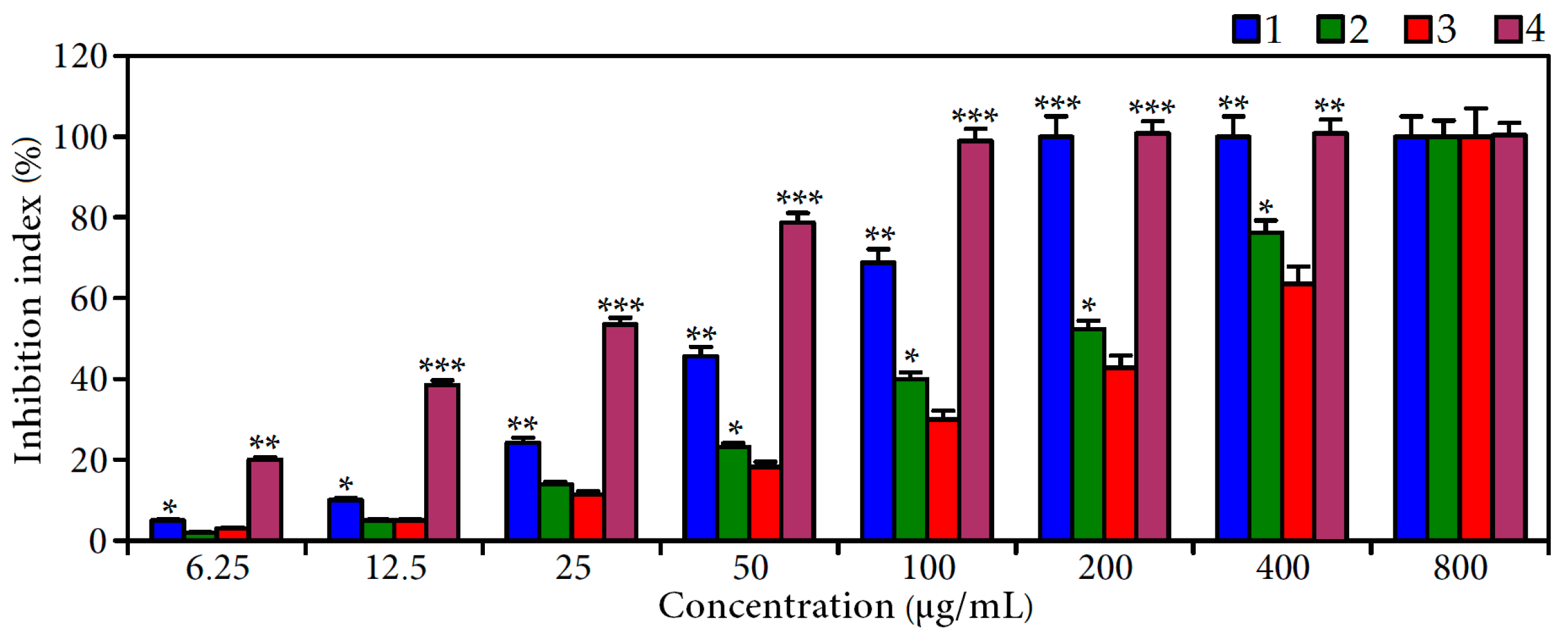 α-Glucosidase inhibition of C. palustre extracts A (1); and B (2); acarbose (3); and agrimoniin (4). Values shown are mean ± SD (n = 3). Asterisks indicate statistically significant differences from acarbose (* p < 0.05; ** p < 0.01; *** p < 0.001).