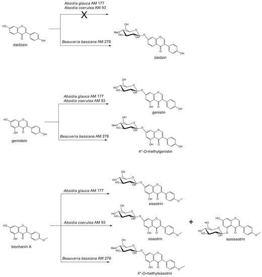 Our previous research on microbial metabolism of flavonoids revealed that the fungal strains Beauveria bassiana AM 278, Absidia glauca AM 177 and Absidia coerulea AM 93 are able to attach sugar moiety to the chalcones and flavanones [22,23,24]. Therefore, biotransformation of daidzein, genistein and biochanin A, the aglycones of the most commonly occurring isoflavones, using those microorganisms was investigated.