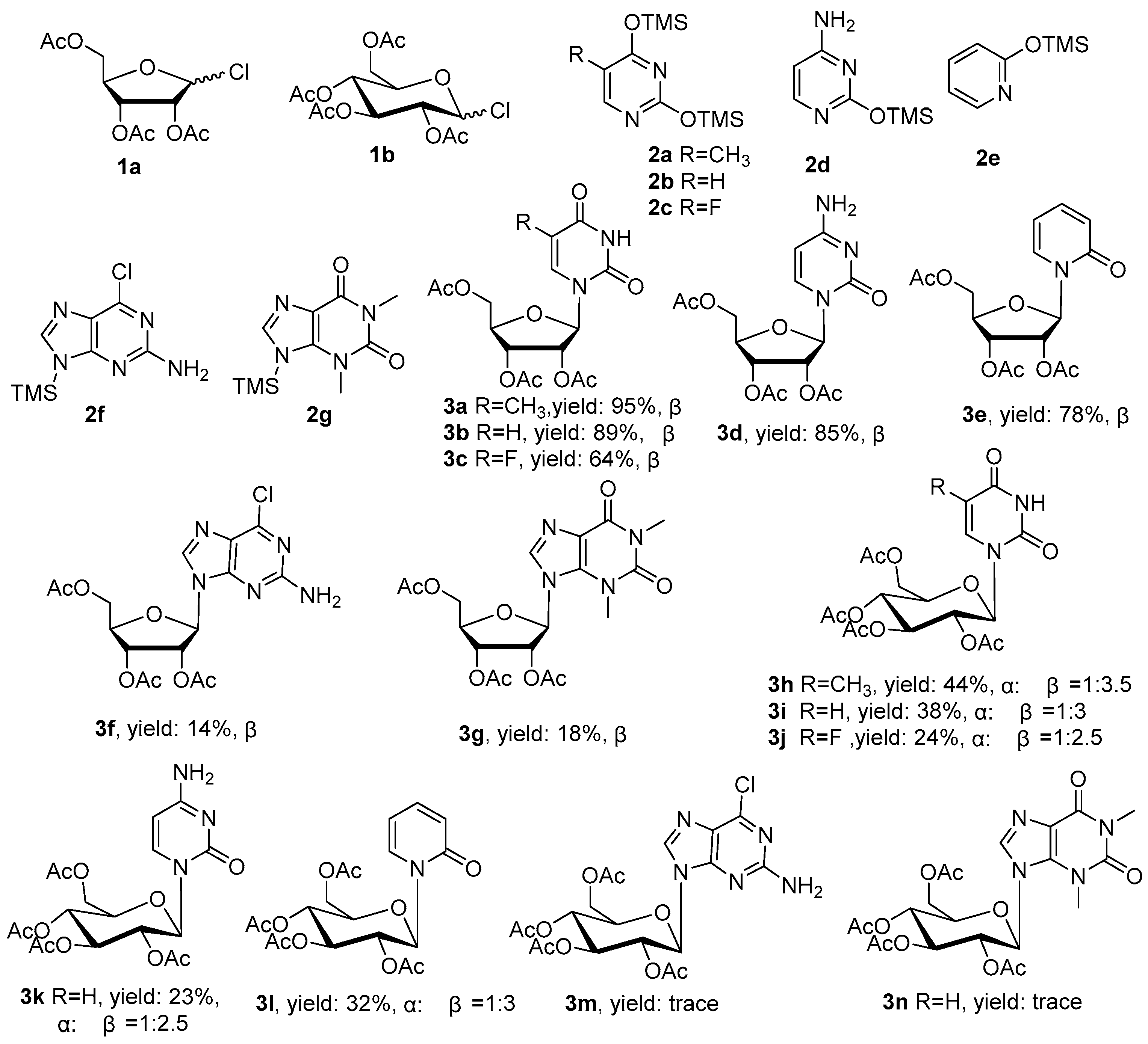- Liu, G.J.; Zhang, X.T.; Xing, G.W. Cheminform abstract: A general method for N-glycosylation of nucleobases promoted by (p-TOL) 2 SO/Tf 2 O with thioglycoside as donor. ChemInform 2015, 46, 12803–12806. [Google Scholar]