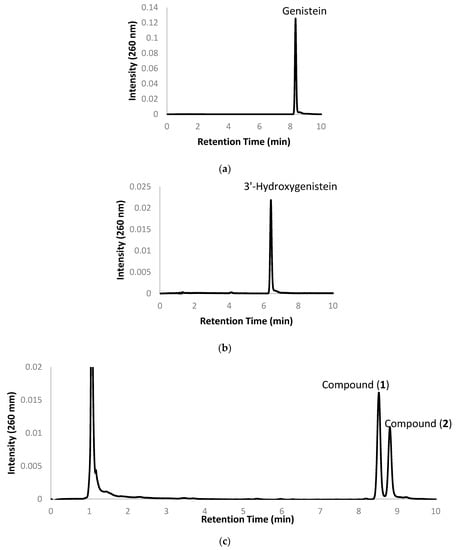 In a second biotransformation, the produced 3′-hydroxygenistein from the first biotransformation reaction was incubated with the recombinant E. coli expressing S. peucetius O-methyltransferase in the presence of 1 mM of S-adenosylmethionine (SAM) for 24 h. Figure 1c shows the UPLC profile of the second biotransformation reaction product. In the figure, two new peaks appear—compounds (1) and (2), with retention times of 8.52 and 8.81 min, respectively. The results revealed that the 3′-hydroxygenistein produced by the first biotransformation reaction was further biotransformed in the second biotransformation reaction.