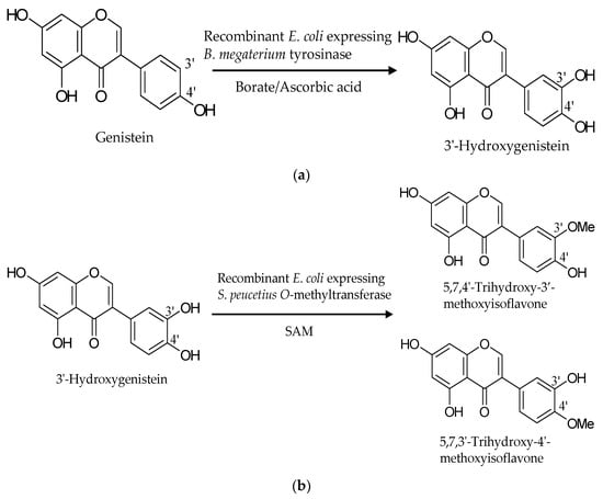- Hosny, M.; Rosazza, P.N. Microbial hydroxylation and methylation of genistein by Streptomycetes. J. Nat. Prod. 1999, 62, 1609–1612. [Google Scholar] [CrossRef]