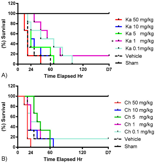 Kaplan–Meier plots of the survival rates (%) of cecal ligation and puncture (CLP)-challenged septic ICR mice treated with different doses of (A) kaempferol; (B) chrysin within 7 days. Animals were i.p. injected with treatments or vehicle (10 mL/kg) 1 h prior to CLP challenge, * p = 0.01.