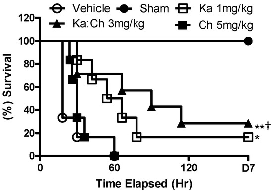 Effects of combinatorial treatments on the survival rate (%) of CLP-challenge septic mice within 7 days. CLP/Vehicle (2% DMSO and 5% Tween-20/phosphate-buffered saline (PBS)) (○); Sham (●); CLP/Ka:Ch 3 mg/kg (▲); CLP/Ka 1 mg/kg (□); CLP/Ch 5 mg/kg (■). Animals were i.p. injected with treatments or vehicle (10 mL/kg) 1 h prior to CLP challenge, * p ≤ 0.01 and ** p ≤ 0.005 versus CLP/vehicle, † p = 0.05 versus CLP/Ch chi-square and log-rank test).