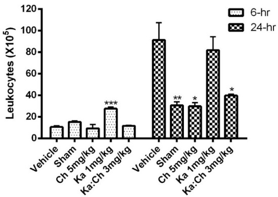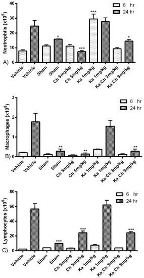 Results from Figure 4 show an increasing trend in total leukocyte cell population from 6 to 24 h. Kaempferol at 1 mg/kg significantly increased the leukocytes numbers at 6 h (p ≤ 0.001) and maintained this high population for up to 24 h. Meanwhile, chrysin at 5 mg/kg and the combination of kaempferol/chrysin at 3 mg/kg maintained a significantly low leukocyte population at 24 h compared to the vehicle control group. Likewise, the kaempferol treatment at 1 mg/kg maintained high neutrophil, macrophage, and lymphocyte populations, as displayed in Figure 5, while the chrysin (5 mg/kg) and kaempferol/chrysin (3 mg/kg) treatments maintained significantly lower populations compared to the vehicle control group.