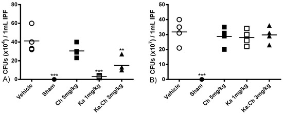 The effects of kaempferol and chrysin individual and combination treatments on bacterial colony forming units (CFUs) growth number/mL of IPF, at (A) 6 and (B) 24 h post-CLP. Abdominal swabs plated on nutrient agar and incubated for 24 h prior to CFU count. Data are presented as mean CFUs/mL. ** p ≤ 0.01 and *** p ≤ 0.001 versus CLP/vehicle of the same time point (Student’s t-test).