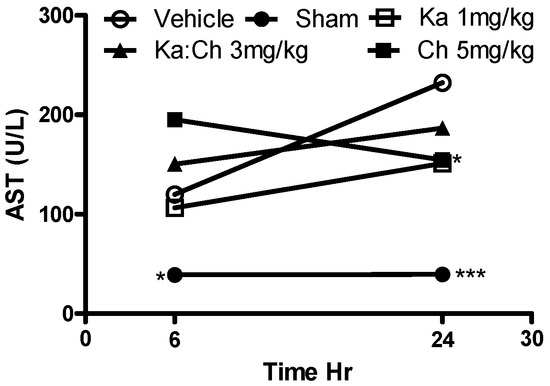 Time course profile of kaempferol and chrysin individual and combination treatments on serum aspartate aminotransferase (AST) levels in septic mice determined using ELISA kit. Each point represents the mean of four experiments. * p ≤ 0.05 and *** p ≤ 0.001 versus CLP/vehicle (Student’s t-test).