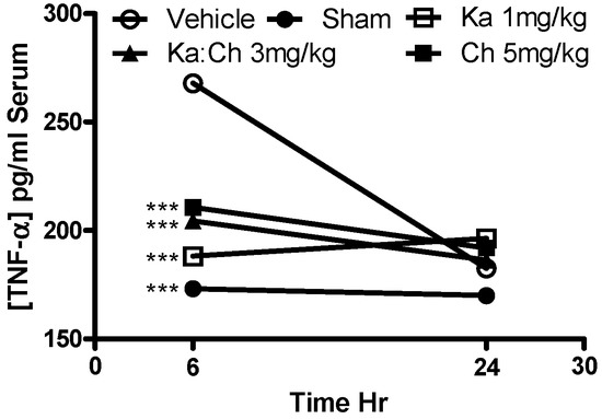 Time course profile of kaempferol and chrysin individual and combination treatments on serum tumor necrosis factor-alpha (TNF-α) levels in septic mice determined using ELISA kit. Each point represents the mean of four experiments. *** p ≤ 0.001 versus CLP/vehicle (Student’s t-test).