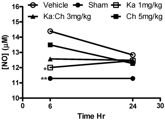 Figure 9 shows that only kaempferol at 1 mg/kg significantly reduced serum nitrate levels (p ≤ 0.05) at 6 h compared to the CLP/vehicle control group. Meanwhile, the sham-operated group maintained a baseline nitrite level.