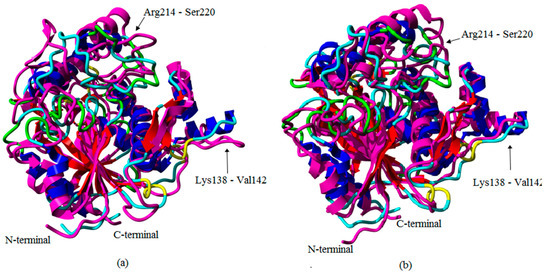 - Groot, B.L.; Hayward, S.; van Aalten, D.M.F.; Amadei, A.; Berendsen, H.J.C. Domain motions in bacteriophage T4 lysozyme: A comparison between molecular dynamics and crystallographic data. Proteins 1998, 31, 116–127. [Google Scholar] [CrossRef]