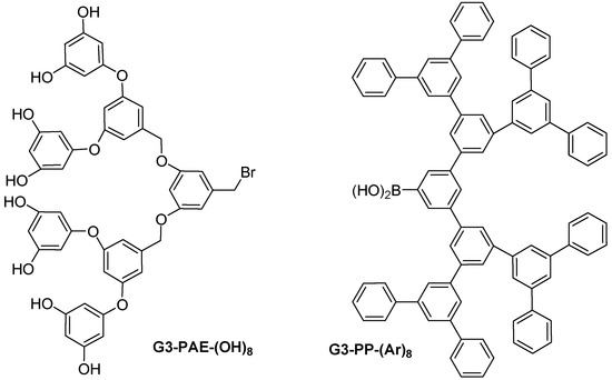 Example of 3rd generation poly(aryl ether) and poly(phenylene) dendrimers.