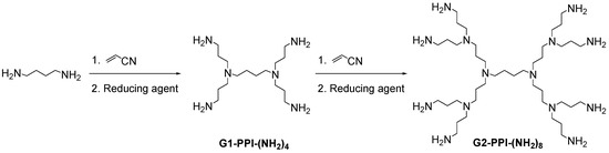 In 1978, Vögtle et al. [3] described the first “cascade synthesis” of a dendritic molecule, a divergent approach that lead to a poly(propylene imine) (PPI) skeleton (Scheme 1). It was based on a repetitive reaction sequence of Michael addition of a primary mono- or oligodiamine to acrylonitrile and subsequent reduction of the nitrile groups to generate primary amines. Several reducing agents [26] have been used for this purpose as Ni-Raney, LiAlH4, Co(II)-borohydride complexes, BH3·THF, etc.
