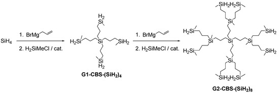 Parallel to PPI dendrimer synthesis, Fetters [29] inaugurated in 1978 the synthesis of CBS dendrimers, the most important class of silicon-based dendrimers. A divergent strategy was used, through consecutive reactions of hydrosilylation of alkenyl groups and subsequent ω-alkenylations with Grignard reagents (Scheme 2). This synthetic route is highly versatile without drastic changes in the reaction conditions, being able to introduce different hidrosilylation reagents (HSiCl3, HMeSiCl2), ω-alkenylation reagents (allylmagnesium bromide, vinylmagnesium bromide) and also the core molecule (SiCl4, tetraallylsilane, tetravinylsilane, triallylmethylsilane). These changes clearly influence the dendritic structure, as can be observed in the different works by Made, Muzafarov, Zhou and Morán [30,31,32,33,34].