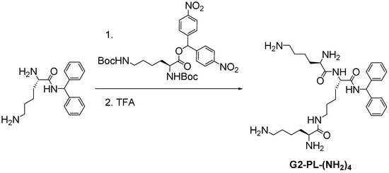At the beginning of the 1980s, Denkewalter [4,37] developed the first synthetic strategy leading to a well-defined poly(l-lysine) family of dendrimers [38]. Built from a benzhydrylamine core, the polypeptide dendrimer grew up to the tenth generation through a repetitive sequence of protection/deprotection using N,N’-bis(tert-butoxycarbonyl)-l-lysinenitrophenyl ester as reagent (Scheme 3).