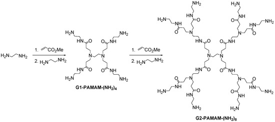 During the same decade of the 80s, Tomalia [5] published the first synthesis of PAMAM dendrimers, based on ethylenediamine core. The divergent strategy is based in a two-step sequence of a Michael-type addition of methyl acrylate to amines and subsequent attack with ethylenediamine to form amide bonds (Scheme 5).
