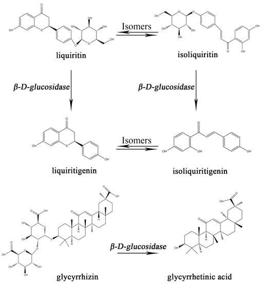 - Dong, S.Q.; Fan, H.R.; Li, Q.S.; Wei, G.L.; Liu, W.H.; Si, D.Y. In vivo metabolic pathway of liquiritin in rats. Chin. Tradit. Herb. Drugs 2014, 45, 2499–2505. [Google Scholar]