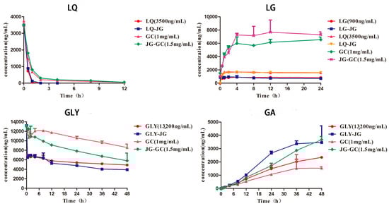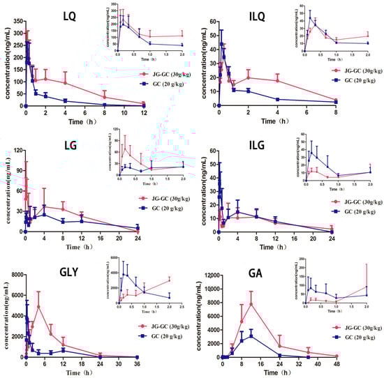 Time–concentration profiles of LQ, ILQ, LG, ILG, GLY and GA in rat plasma from Group 1 (