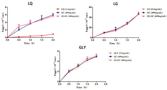 According to Papp for the analytes, as shown in Table 2 and Figure 3, LG exhibited good permeability (Papp > 10−5 cm/s), suggesting that LG could be easily absorbed. Meanwhile, the Papp values of LG and GLY increased with the extension of time in each group. However, obvious differences did not exist between LG alone and LG combined with GC or JG–GC. This result demonstrated that there were no other ingredients in Jiegeng or in Gancao that affected the absorption of GLY and LG. Conversely, the Papp value of LQ, a flavonoid glycoside in Gancao, was less than 10−6 cm/s in the LQ without GC or JG–GC but increased in the GC and JG–GC groups, however, no difference appeared between these two groups. The results mentioned above suggest that LQ has poor absorption and some ingredients in Gancao could promote the absorption of LQ.