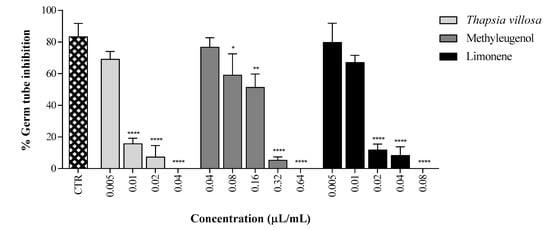 Percentage of germ tube formation by Candida albicans ATCC 10231 incubated with Thapsia villosa essential oil and its main components methyleugenol and limonene. Results are expressed as mean ± SD of three independent experiments. Statistical differences at * p < 0.05, ** p < 0.01 and **** p < 0.0001 (ANOVA, Tukey HSD multiple comparison test), face to the control.