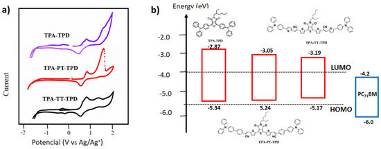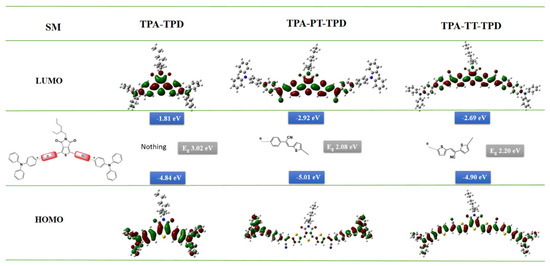 SMs were evaluated by cyclic voltammetry (CV). The recorded CV curves can be shown in Figure 3 and extracted data are listed in Table 1. For TPA-TPD, TPA-PT-TPD and TPA-TT-TPD, the onset oxidation potentials () are determined to be 0.68, 0.62 and 0.55 V, respectively. The HOMO energy for the SMs was calculated based on the equation EHOMO = −[(Eox + 4.4) + 0.22] eV, where Eox is the recorded onset oxidation potentials of SMs. 4.4 eV is the energy level of ferrocene/ferrocenium (Fc/Fc+) below the vacuum level and 0.22 eV is the correction by the reference used electrode [50]. The resulting HOMO values were −5.34, −5.24 and −5.17 eV, for TPA-TPD, TPA-PT-TPD and TPA-TT-TPD, respectively. LUMO energy levels were determined using the onset reduction potentials to be −2.47, −3.05 and −3.19 eV for TPA-TPD, TPA-PT-TPD and TPA-TT-TPD, respectively.