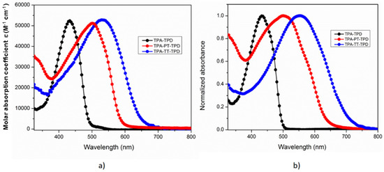 Figure 2 displays the molar absorption coefficient of the SMs in solution (Figure 2a), as well as the normalized ultraviolet–visible (UV-Vis) absorption spectra in solid thin films (Figure 2b). Molar absorption coefficients of TPA-TPD, TPA-PT-TPD and TPA-TT-TPD are very similar: 52,382, 51,200 and 52,892 M−1 cm−1 respectively.