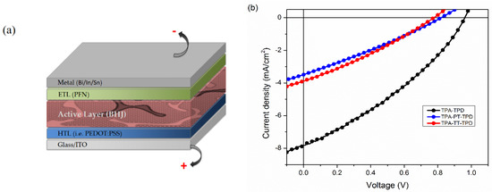 OSCs were fabricated under the BHJ approach by using TPA-TPD, TPA-PT-TPD and TPA-TT-TPD as electron donors and PC71BM as the electron acceptor in the active layer. The generally-used configuration for the devices was ITO/PEDOT:PSS/SM:PC71BM/PFN/FM (Figure 4a). The active layer was spin coated from a chlorobenzene solution of SM:PC71BM; ratios were varied from 1:1 to 1:4 w/w D:A (see Supplementary Materials: SM). The average PCE was determined from eight cells manufactured under the same conditions (see SM).