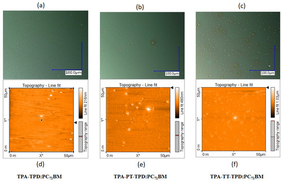 Figure 5d–f shows the surface morphology images for active layers acquired by atomic force microscopy AFM. TPA-TPD:PC71BM film blend exhibited a relatively flat surface with a root-mean-square (RMS) roughness of 10 nm, while for films based on TPA-PT-TPD:PC71BM and TPA-TT-TPD:PC71BM, RMS roughness values are 22 and 28 nm, respectively. These morphology irregularities could be since TPA-PT-TPD and TPA-TT-TPD are not completely miscible with the PC71BM (in these two cases, a smaller amount of the acceptor was used; see Table 2). Then, in Figure 5c,f (and to a lesser extent in Figure 5b,e) aggregates can be clearly observed. These micro-aggregates can provoke charge recombination, which causes a decrease in the current density values. Further, these micro-aggregates could also act as traps that increase the overall device resistance, which gives rise to low FF values (0.27–0.33) [54,55,56,57].