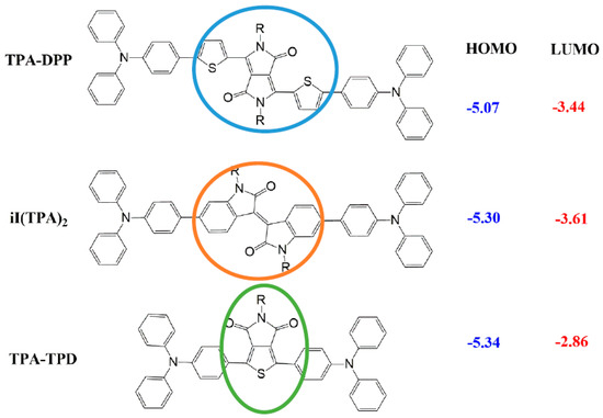 HOMO-LUMO energy level comparison of two low molecular weight molecules with D-A-D structures using iI [33], DPP [34], with respect to TPD as A fragments.