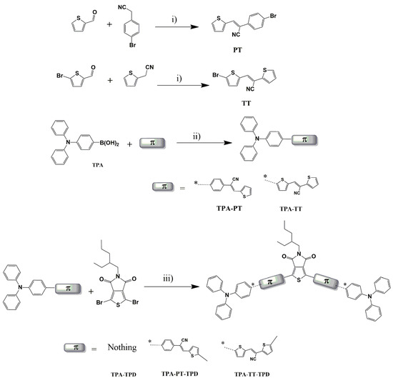 Synthetic route of the conjugated organic small molecules (SMs) are depicted in Scheme 1. Chang, S.Y. et al. [44] reported the 1,3-bis(4-(diphenylamino)phenyl)-5-(2-ethylhexyl)-4H-thieno[3,4-c]pyrrole-4,6(5H)-dione (TPA-TPD) synthesis by direct arylation under conventional heating at 110 °C for 48 h using Pd(OAc)2 as catalyst, reaching yields of 51%. In this work, the synthesis of TPA-TPD is reported through Suzuki reaction by using Pd(PPh3)4 as catalyst and microwave (MW) heating at 110 °C for 1 h, getting yields of 70%. For the synthesis of (2Z,2′Z)-3,3′-(5,5′-(5-(2-ethylpentyl)-4,6-dioxo-5,6-dihydro-4H-thieno-[3,4-c]pyrrole-1,3-diyl)bis(thiophene-5,2-diyl))bis(2-(4′-(diphenylamino)-[1,1′-biphenyl]-4-yl)acrylonitrile) (TPA-PT-TPD) and (2E,2′E)-2,2′-(5,5′-(5-(2-ethylpentyl)-4,6-dioxo-5,6-dihydro-4H-thieno[3,4-c]pyrrole-1,3-diyl)bis(thiophene-5,2-diyl))bis(3-(5-(4-(diphenylamino)phenyl)thiophen-2-yl)acrylonitrile) (TPA-TT-TPD), firstly the synthesis of (Z)-2-(4-bromophenyl)-3-(thiophen-2-yl)acrylonitrile (PT) was carried out by Knoevenagel condensation between 4-Bromophenylacetonitrile and 2-thiophenecarboxaldehyde, while the synthesis of (E)-3-(5-bromothiophen-2-yl)-2-(thiophen-2-yl)acrylonitrile (TT) was carried out by Knoevenagel reaction between 2-thienylacetonitrile and 5-Bromo-2-thiophenecarboxaldehyde.