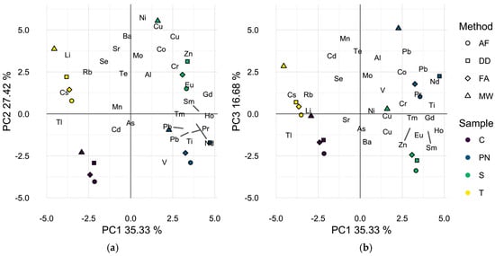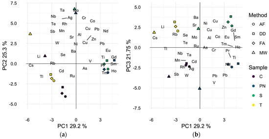 To better represent differences in wine elemental profiles, isotopes that showed no significant sample effect by ANOVA with the method blanks were excluded and a second PCA was performed, Figure 2a,b. Five elements, 93Nb, 101Ru, 103Rh, 107Ag, and 181Ta were excluded as a result of this analysis. Additionally, 123Sb and 182W were omitted, since method blank concentrations exceeded levels encountered in the samples by at least one method. Interestingly, the first two principal components (62.8% of total variance) in this analysis separated the samples primarily by wine grape cultivar with each wine prepared by all methods localized in one of the four quadrants of the data space. This result suggests that all preparation methods used may adequately differentiate these wines by elemental composition and explains the previously reported successful applications of different sample preparation methods in discriminant analyses of wine on the basis of geographic origin [,,,,]. Nevertheless, closer inspection of the biplot of the wines in the first and third dimensions (52.0% of total variance), Figure 2b resembles Figure 1a in that the microwave digested wine samples appear to be separated in the data space from wines of the same grape cultivar, prepared by DD, AF, or FA. It is likely that the omission of 123Sb and 182W contributed to the less dramatic spatial separation by preparation strategy in Figure 2b as average wine concentrations were significantly higher in MW samples than all other methods. However, the same general trend is observed.