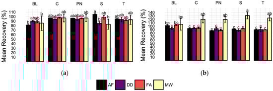 Recovery of 100 µg/L 65Cu additions to each wine sample and method blank was expected to vary with respect to sample preparation method after ANOVA revealed a significant sample preparation method effect for 65Cu. However, recoveries were not found to be significantly different by ANOVA, Figure 3a. Comparison of mean recoveries of each method by wine cultivar shows no significant differences among methods for all samples except the Syrah (S), in which AF yielded significantly higher recoveries than both DD and MW. Recoveries in MW samples were the least precise with an average RSD of 11.98 (%) per sample. In contrast, RSDs of the direct methods were all below four percent. Despite differences in recovery precision among the methods, it is important to note that total 65Cu recoveries for all methods ranged from 80 to 105% and were not found to be significantly different by Tukey’s Honestly Significant Differences (HSDs).