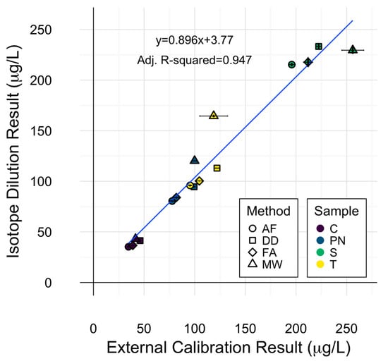 The use of stable isotope standards for spiking experiments allowed for the exploration of applying isotope ratios as a means of quantitation. Internal calibration via isotope dilution was explored in this experiment and compared to external calibration by measuring the 63Cu:65Cu instrumental response ratio. ANOVA of copper concentrations of each sample with calibration method as an additional source of variation (i.e., quantitation method was either external or internal), did not reveal significant differences due to calibration technique. The high degree of agreement between calibration techniques is represented by the linear fit depicted in Figure 4, in which a slope of 1 would indicate a perfect agreement. Isotope dilution results were within 12% of external calibration results for all samples within each preparation method, except for PN and T samples prepared via microwave digestion, in which isotope dilution yielded higher concentrations than external calibration. This could be explained by the ability of isotope dilution to account for analyte loss during sample preparation [].
