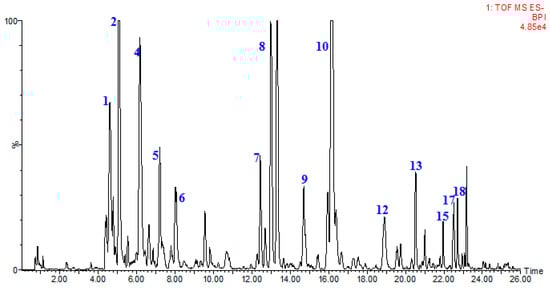 | 16 | quercetin | 22.24 | 255 347 | C15H10O7 | 301.0348 | 301.0330 [M − H]− | −1.8 | 285.0398, 151.0018 |
