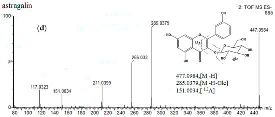 | 10 | astragalin | 16.21 | 264 346 | C21H20O11 | 447.0927 | 447.0936 [M − H]− | 2 | 285.0398, 151.0018 |