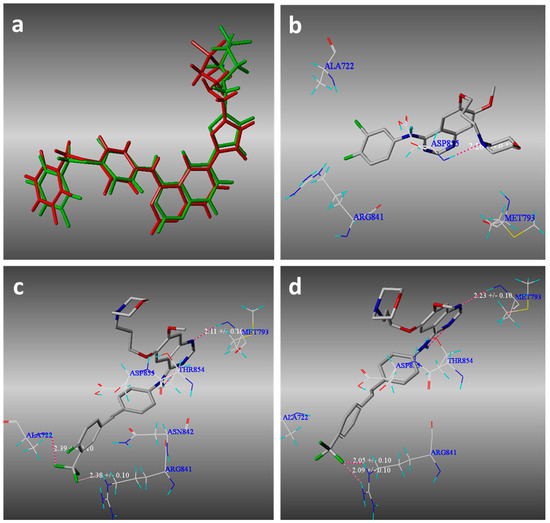 Gradient-optimized pose of Lapatirib (red) versus crystallographically determined structure (green) (a). Docking of compounds Gefitinib (b), 6i (c), and 6c (d) into the active site of epidermal growth factor receptor (EGFR).