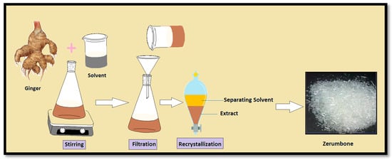 Recently Tzeng et al. used air-dried Zingiber zerumbet for the extraction of ZER. They added 10 L of 95% ethanol to 5 kg of pulverized Zingiber zerumbet at room temperature for seven days and with shaking. After evaporation to dryness under reduced pressure, followed by lyophilization about 575 g of dry residue was obtained [46]. Amer et al. and Sriphana et al. also using this method for the extraction of ZER using ethanol at room temperature and analyzed its antimalarial activity and cytotoxicity [47,48]. Numerous studies have been done using solvent extraction for ZER derived from ginger with methanol, ethanol, hexane, etc., in different ratios [46,49,50,51,52,53,54]. The solvent extraction process is shown in Figure 3.