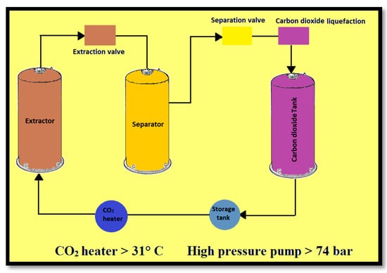 The contact between a pressurized solvent and a solid raw material is the basis of the supercritical fluid extraction (SFE) process, which leads to removal of desirable compounds from the solid phase. In the next step, by pressure reduction, the extract is separated from the solvent. This method has been used recently as an alternative to conventional techniques, such as steam distillation and extraction using organic solvents, because the resulting extract is richer in desirable compounds [51,61]. In practice carbon dioxide (CO2) is used in most of analytical supercritical fluid extraction (SFE) processes due to several reasons. CO2 is non-flammable, non-toxic, relatively low cost and available in high purity and can be removed easily from the extract. Moreover, carbon dioxide has a low critical pressure (74 bar) and temperature (32 °C), respectively. In comparison with liquid pentane, in the supercritical state, CO2 is more polar and therefore, is more suitable for extracting lipophilic compounds. The main disadvantage of carbon dioxide concerns the extraction of polar analytes due to its lack of polarity. In the supercritical fluid extraction method, some solvents have been applied for a wide range of applications applications like extraction of metal cations and essential oils, and also the synthesis of polymers and particle nucleation [61].