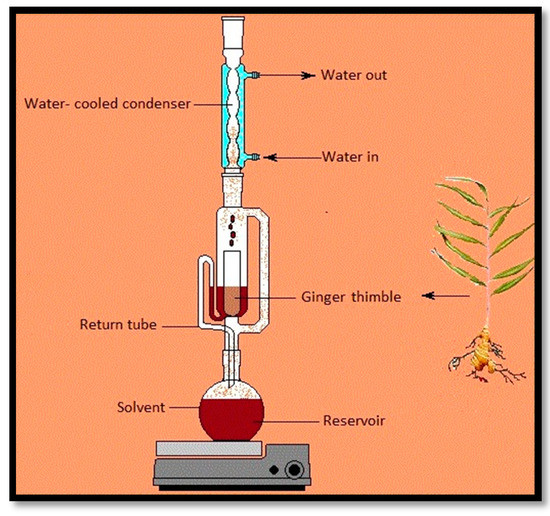 Among the extraction approaches, hydrodistillation (HD), has been the most used extraction method for essential compounds from plant materials such as flowers or wood, and is often applied to isolate non-water-soluble natural products with high boiling points. The HD process involves the complete immersion of the plant species material in water and then boiling. In this method the extracted oils are protected by the surrounding water which is used as a preventive barrier against overheating. The aqueous fraction is obtained by condensing the essential oil vapor. This method has some advantages such as the required materials can be distilled at below 100 °C. In a recent study, Zulazmi et al. isolated ZER from the rhizomes of Z. zerumbet Smith. Sliced (0.5–1 mm) rhizomes were placed in a round bottomed flask which was connected to a modified trap and condenser. During the installation process, distilled hexane was added as an organic agent to increase the oil extraction from the condensed vapor. The hexane layer was collected for the next process. By evaporation of the solvent, ZER was obtained. NMR spectroscopy and HPLC were used to identify the ZER and purity (99.8%) confirmation [55]. In another study, Ibrahim et al. isolated ZER using a hydrodistillation method. In order to collect the vaporized steam containing the volatile oil, they placed sliced ginger in a flask containing water and then connected the glassware and heated the mixture. Using cool water, the volatile oil was crystallized. High purity ZER was obtained using hexane [56]. Siavasothy et al. in 2012 isolated some essential oils of the rhizomes and leaves of Zingiber spectabile Griff by hydrodistillation. In total they identified 80 compounds in the leaf and rhizome oils [57].