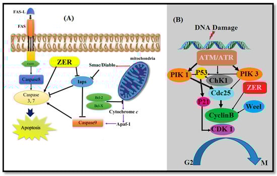 Proposed signaling pathways of ZER-induced apoptosis in cancerous cells (A); The cytotoxicity effects of ZER on leukemia cells through cell cycle arrest (B).