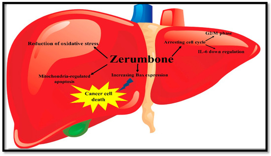 Briefly, in 2010 Taha et al. assessed the antitumourigenic effects of ZER in rats which were exposed to injection of dietary 2-acetylaminofluorene and diethylnitrosamine. Then rats also received ZER using intraperitoneal injection in different dosages for 22 times during 11 weeks. They also used histopathological evaluations. The results showed the protective role of ZER against the carcinogenic effects of dietary 2-acetylaminofluorene and diethylnitrosamine. Treatment with ZER leads to significant lower amount of serum alanine transaminase, aspartate transaminase, α-fetoprotein and alkaline phosphatase compared with rats with untreated liver cancer. There was a significant increase in liver malondialdehyde concentrations in untreated rats which indicates peroxidation of hepatic lipids. Moreover, the hepatic tissue glutathione concentrations decreased significantly. In the livers of dietary 2-acetylaminofluorene and diethylnitrosamine rats, ZER treatment leads to an increase and decrease in Bax and BCL-2 protein expression, respectively, that suggested increased apoptosis. As revealed in Figure 7, induction of mitochondria-regulated apoptosis of liver cancers are the key pathways of ZER effects [105].