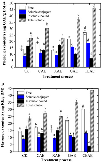 Contents of phenolics (A) and flavonoids (B), including free, soluble-conjugate, insoluble-bound, and total soluble extracts from guava leaves after different enzyme-assisted extraction. CK, untreated; CAE, cellulase-assisted extraction; XAE, xylanase-assisted extraction; GAE, β-glucosidase-assisted extraction; CEAE, complex enzyme-assisted extraction. Values with different letters in each column are significantly different following enzyme-assisted extraction. All experiments were repeated three times and data are expressed as the mean ± standard deviation (SD).