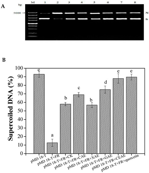 Protective effects (A,B) of soluble phenolic extracts following different enzyme-assisted extraction methods against DNA oxidation inducted by Fenton’s reagent (FR). The gel was visualized under UV-transilluminator using the Gel Doc XR system (Bio-Rad, Hercules, CA, USA). M: 5000 bp DNA marker; Lane 1: pMD 18-T+ PBS solution; lane 2: pMD 18-T+FR; lane 3: pMD 18-T+FR + CK; lane 4: pMD 18-T + FR + CAE; lane 5: pMD 18-T+ FR + XAE; lane 6: pMD 18-T+ FR + GAE; lane 7: pMD 18-T+ FR + CEAE; lane 8: pMD 18-T+ FR + quercetin. Values are mean ± standard deviation (n = 3). N, Nicked DNA; S, supercoiled DNA; FR, Fenton’s reagent; CK, untreated; CAE, cellulase-assisted extraction; XAE, xylanase-assisted extraction; GAE, β-glucosidase-assisted extraction; CEAE, complex enzyme-assisted extraction. Different letters (a–e) mean statistically significant differences at p < 0.05.