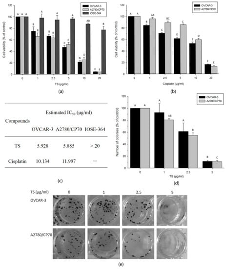 Effects of TS on cell growth and colony formation in vitro in OVCAR-3 and A2780/CP70 human ovarian cancer cells and the cytotoxicity of TS on IOSE-364 normal ovarian cells. (a) TS inhibits cell viability of OVCAR-3, A2780/CP70 and IOSE-364 cells after 24 h. Cell viability was determined via MTS assay; (b) Cisplatin inhibits cell growth of OVCAR-3 and A2780/CP70 cells after 24 h as a control compared with TS’s inhibitory activity; (c) The estimated half-maximal inhibitory concentration (IC50) of TS and cisplatin against ovarian cancer cells and/or normal ovarian cells; (d) Colony formation activity of OVCAR-3 and A2780/CP70 cells was inhibited by TS at 24 h; (e) TS exhibited extensive colony formation inhibitory effects in OVCAR-3 and A2780/CP70 cells at 24 h. The capital letters (A, B, etc.) mean extremely significant differences among different treatments (p < 0.01).