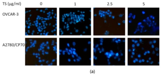Based on the method used in our team [,], briefly, OVCAR-3 and A2780/CP70 cells were seeded into 96-well plates at the density of 1.0 × 104/well and incubated for 16 h prior. Then cells were treated with different concentrations (0 to 5 µg/mL) of TS or RPMI-1640 without 10% FBS (as the control) for 24 h. Subsequently, cells were stained with 10 µg/mL Hoechst 33342 in PBS for 10 min at 37 °C in the dark. Cell apoptosis was detected under a fluorescence microscope (ZEISS, Oberkochen, Germany), and data were collected from three to five replicate experiments.