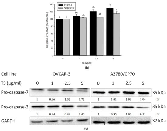 Apoptosis-inducing effects of TS on OVCAR-3 and A2780/CP70 cells. (a) Hoechst 33342 staining of OVCAR-3 and A2780/CP70 cells after treatment with 0 to 5 µg/mL TS for 24 h via fluorescent microscopy (200×). Intact nuclei represents viable cells and highly condensed or fragmented nuclei represent apoptotic cells; (b) Caspase-3/7 activity levels after TS treatment (0 to 5 µg/mL) for 24 h. The caspase-3/7 activity of control group was arbitrarily expressed as 100%; (c) Protein expression levels of pro-caspase-3 and -7 determined by Western blotting assay. Data represents mean ± SD of three independent experiments. Lower case letters (a, b, etc.) mean significant differences among different treatments (p < 0.01). “IF” means impact factor and represents the Western blotting signals were quantified and normalized to the loading control GAPDH.