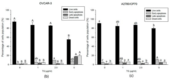 TS induces apoptosis in OVCAR-3 and A2780/CP70 cells. (a) Flow cytometry of TS treated OVCAR-3 and A2780/CP70 cells using a double staining method with FITC-conjugated Annexin V and PI. The upper left and lower left quadrant indicate the percentage of dead and live cells, respectively. The upper right and lower right quadrants indicate the percentage of late and early apoptotic cells, respectively; (b) Bar graphs showing the percentage of cell population of live cells, early apoptosis cells, late apoptosis cells and dead cells with treatment 0 to 5 µg/mL TS in OVCAR-3; (c) A2780/CP70. The capital letters (A, B, etc.) denote extremely significant differences among different treatments (p < 0.01); and lower case letters (a, b, etc.) mean significant differences among different treatments (p < 0.05).