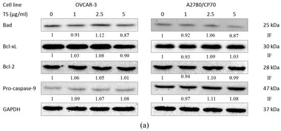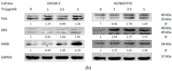 Effects of TS on the intrinsic apoptotic pathway and extrinsic apoptotic pathway in OVCAR-3 and A2780/CP70 cells. (a) The intrinsic apoptotic pathway related protein expression levels of Bad, Bcl-2, Bcl-xL, and pro-caspase-9 with 0 to 5 µg/mL TS treatment for 24 h by Western blotting; (b) The extrinsic apoptotic pathway-related protein expression levels of FasL, DR5, and FADD after 0 to 5 µg/mL TS treatment for 24 h by Western blotting. “IF” means impact factor and represents the Western blotting signals were quantified and normalized to the loading control GAPDH.