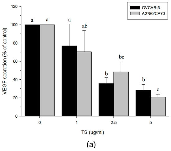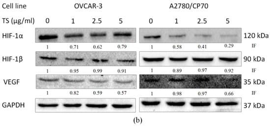 A VEGF ELISA assay confirmed the reduction of VEGF in a culture supernatant form through TS treatment (Figure 5a, p < 0.05). Our results showed that TS treatments diminished the secretion of VEGF. VEGF secretion was decreased from 76.8% to 28.6% in OVCAR-3 cells and from 70.3% to 20.7% in A2780/CP70 cells when treated with 1 to 5 µg/mL of TS. Western blotting analysis revealed that TS decreased the expression of hVEGF and HIF1α, but had no influence on the expression of HIF-1β (Figure 5b). These results suggest that TS reduces VEGF expression through a HIF1α-dependent pathway rather than through an HIF-1β pathway.