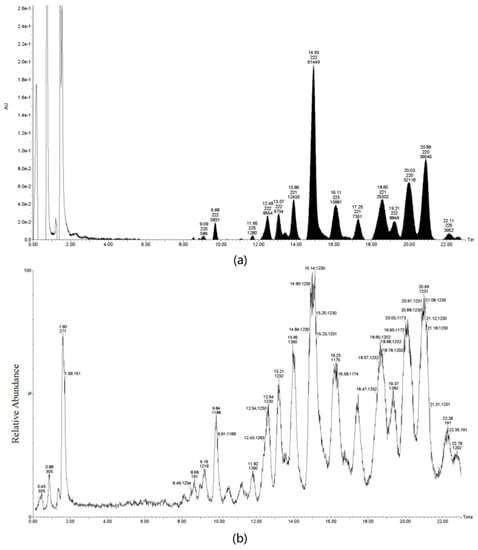UPLC-MS analysis of TS isolated from green tea seeds. (a) Base peak intensity chromatogram at 210 nm; (b) Base peak intensity chromatogram at m/z 100–2000.