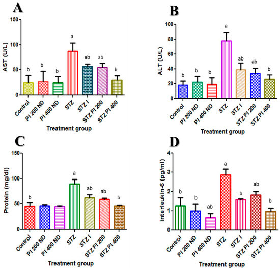 Effect of PBPi on serum liver function and serum interleukin-6 (IL-6). (A) AST (U/L), (B) ALT (U/L), (C) Protein (mg/dL), (D) Interleukin-6 (pg/mL). Data are presented as mean ± S.D. (n = 10). Mean differences are significant (p < 0.05) when compared with: a control group, b STZ only.