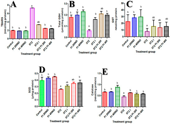 Effect of PBPi on assessment of oxidative stress and antioxidants. (A) TBARS (nmol/mg protein), (B) Total GSH (μmol/mg protein), (C) GST (nmol/mg protein), (D) SOD (μ/mg protein), (E) CAT (nmol/mg protein). Data are presented as mean ± S.D. (n = 10). Mean differences are significant (p < 0.05) when compared with: a control group, b STZ only. Thiobarbituric acid reactive substances (TBARS), total reduced glutathione (Total GSH), glutathione-S-transferase (GST), superoxide dismutase (SOD), catalase (CAT).